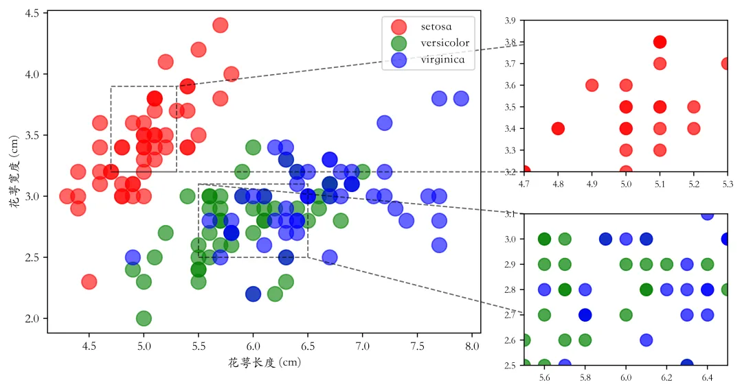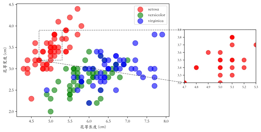 # 创建嵌入的局部放大区域axins1 = ax.inset_axes([1.1, 0.30, 0.47, 0.47]) # 在局部放大区域中绘制相同的数据for category in categories: subset = iris[labels == category] axins1.scatter( subset['花萼长度 (cm)'], subset['花萼宽度 (cm)'], color=colors.get(category, 'gray'), s=100, alpha=0.7)# 设置局部放大区域的显示范围,以突出您感兴趣的区域axins1.set_xlim(4.7, 5.3)axins1.set_ylim(3.2, 3.9)axins1.tick_params(axis='both', which='major', labelsize=8) 、# 添加指示局部放大区域的连线和边框ax.indicate_inset_zoom(axins1, edgecolor="black", linestyle='--', alpha=0.6)plt.show()
