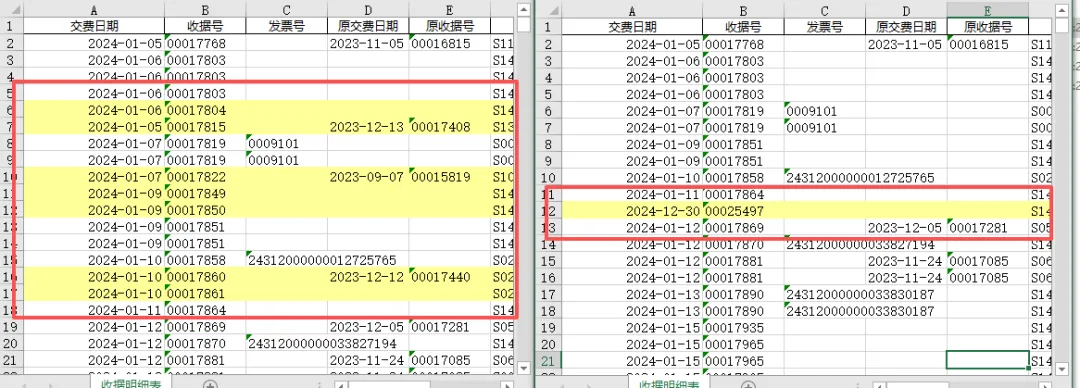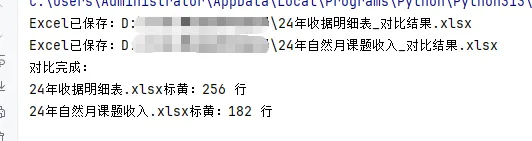 import pandas as pdfrom openpyxl import load_workbookfrom openpyxl.styles import PatternFillfrom collections import Counterf1 = r"D:\示例\票据发票找差异\24年收据明细表.xlsx"f2 = r"D:\示例\票据发票找差异\24年自然月课题收入.xlsx"shouju_col = "收据号"shijiao_col = "实交金额"yellow_fill = PatternFill(start_color="FFFF99", end_color="FFFF99", fill_type="solid")df1 = pd.read_excel(f1, dtype=str).dropna(subset=shouju_col)df2 = pd.read_excel(f2, dtype=str).dropna(subset=shouju_col)key1 = df1[shouju_col].str.strip() + "|" + df1[shijiao_col].str.strip() + "|" + df1[yingjiao_col].str.strip()key2 = df2[shouju_col].str.strip() + "|" + df2[shijiao_col].str.strip() + "|" + df2[yingjiao_col].str.strip()count1 = Counter(key1)count2 = Counter(key2)# 找出差异行标号def get_marked_rows(keys, other_count): marked = [] current = Counter() for idx, key in enumerate(keys): current[key] += 1 # 只要当前行的出现次数 > 对方表格的次数,就标黄 if current[key] > other_count.get(key, 0): marked.append(idx + 2) # Excel行从第2行开始 return markedmarked1 = get_marked_rows(key1, count2) # 表1对比表2的次数marked2 = get_marked_rows(key2, count1) # 表2对比表1的次数# 标黄并保存文件def mark_excel(file_path, rows): if not rows: print(f"\n{file_path} 无多余行") return wb = load_workbook(file_path) ws = wb.active for r in rows: for col in range(1, ws.max_column + 1): ws.cell(row=r, column=col).fill = yellow_fill save_path = file_path.replace(".xlsx", "_对比结果.xlsx") wb.save(save_path)mark_excel(f1, marked1)mark_excel(f2, marked2)print("对比完成:")print(f"{f1.split('\\')[-1]} 标黄:{len(marked1)} 行")print(f"{f2.split('\\')[-1]} 标黄:{len(marked2)} 行")