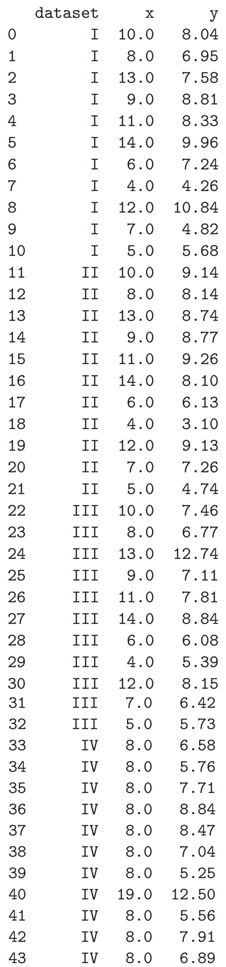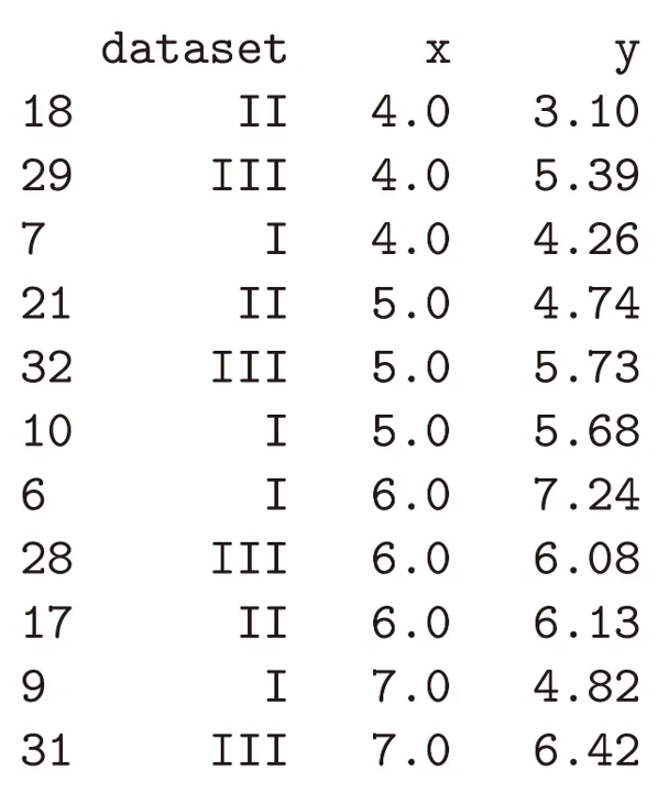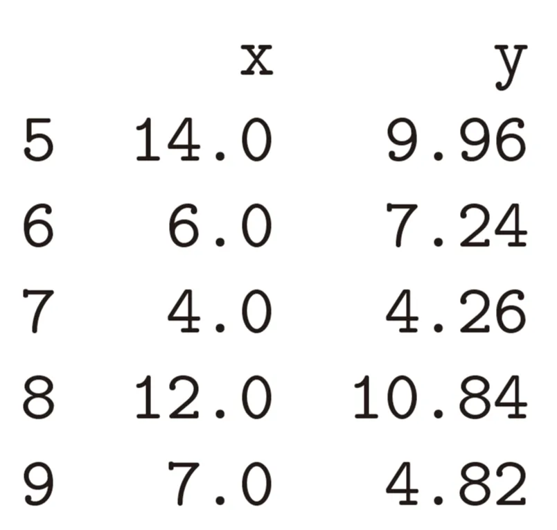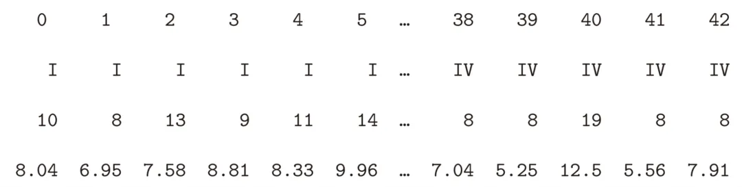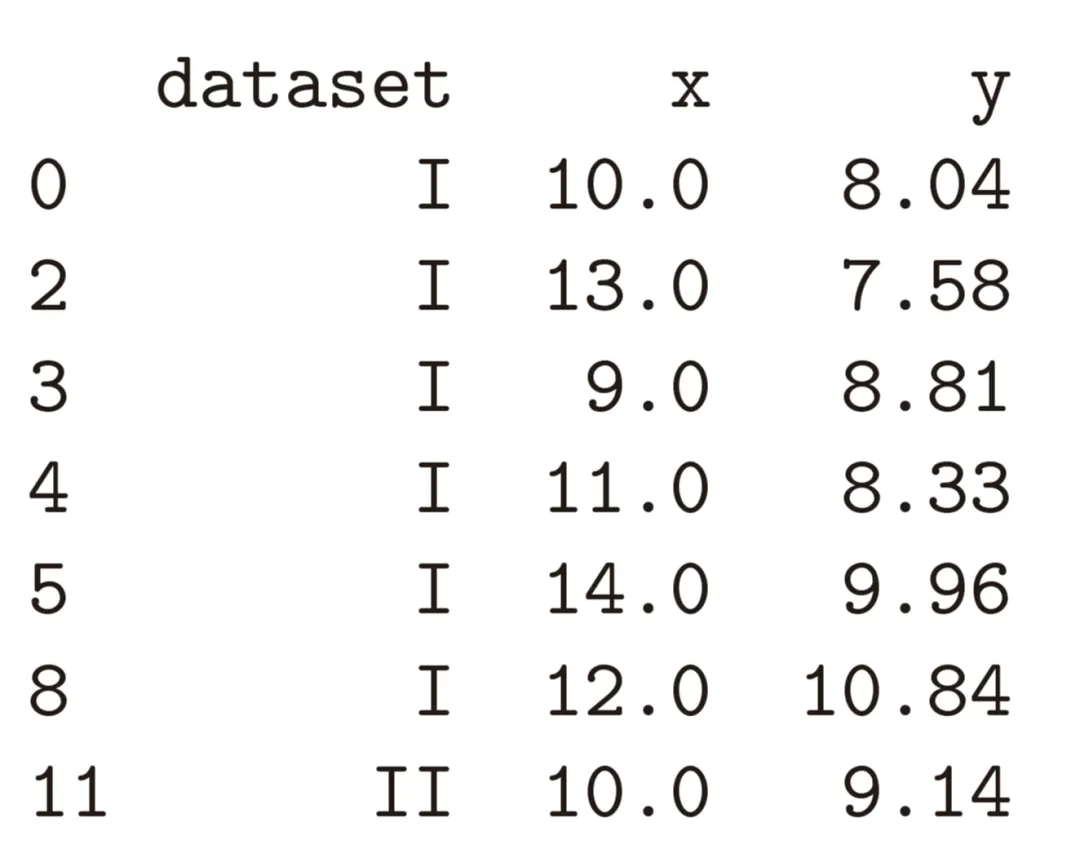 数据集加载完成后,为查看所处理的数据内容,可将数据以表格(即数据框)形式输出。通过该方式可以看到,数据集中dataset列将数据划分为Ⅰ、Ⅱ、Ⅲ、Ⅳ四组,各组分布特征存在差异,可分别开展统计分析。如上表,该数据表共包含4列。第一列为索引(index),仅用于对数据点进行编号;其余各列为当前数据集所对应的特征字段。在编程中,任何数值、函数或数据框均可统称为对象(object),且每个对象均隶属于特定的类(class)。数据框本身即为一种类,原因在于所有数据框均支持相同类型的操作行为。简言之,对Python对象使用type()函数,其本质是获取该对象所属的类信息。