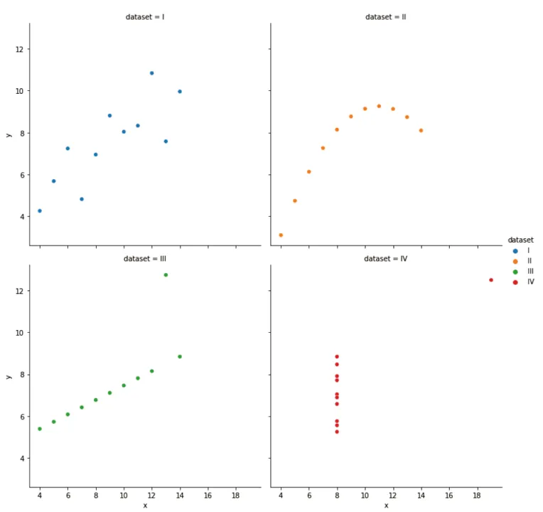 在线笔记本环境相关模块已在远程服务器完成预装(也可在自己的Python环境下自己安装,命令:!pip installSeaborn),在导入Seaborn模块时,Matplotlib库会被自动加载。本研究使用Seaborn内置经典数据集安斯库姆四重奏(Anscombe Quartet),该数据集在统计学中具有重要意义。安斯库姆四重奏(Anscombe's quartet)是统计学家弗朗西斯・安斯库姆提出的一组由四个数据集构成的经典数据集,用来说明统计分析中数据可视化的重要性。这四个数据集都包含11个数据点,每个数据点都由两个变量组成,分别为X和Y。它们的统计学特征,如平均数、方差、相关系数等,高度一致。但当将这四个数据集可视化后,却发现它们的分布情况大不相同。Anscombe Quartet数据集在Seaborn数据库中可直接调用加载。df = sns.load_dataset('anscombe')