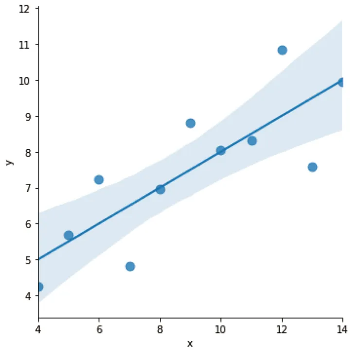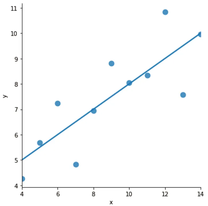 # 数据集I做线性回归sns.lmplot(x="x", y="y", data=df[df['dataset']=='I'], ci=None, scatter_kws={"s":80})