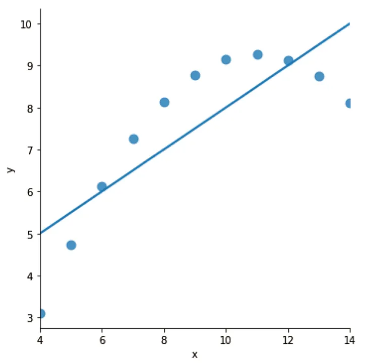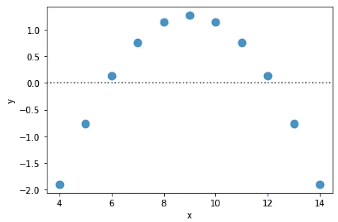 而当我们对区域 II 数据进行同样的操作,结果观察到残差图中的数据点呈现出明显的抛物线趋势。这表明线性回归并不适用于该组数据。sns.residplot(x="x", y="y", data=df[df['dataset']=='II'], scatter_kws={"s": 80})