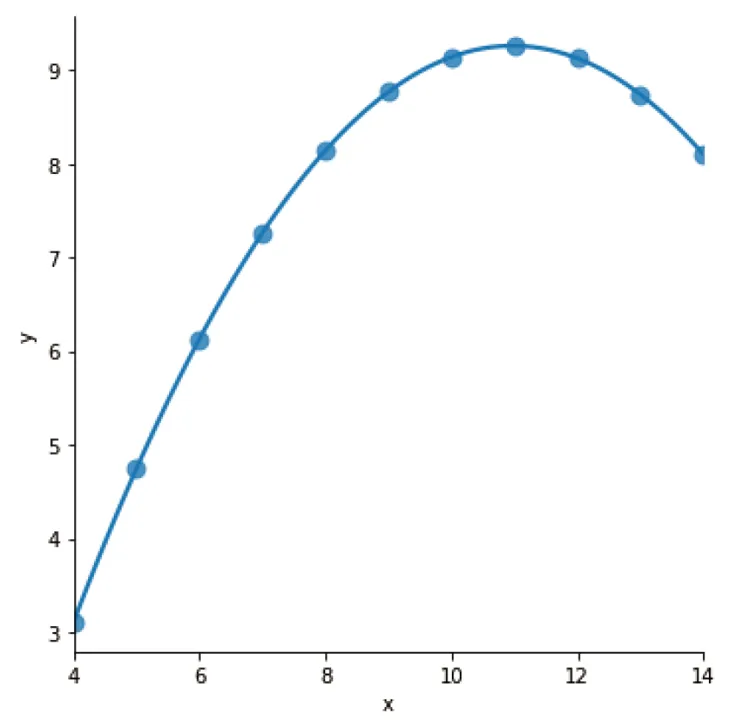 c=sns.lmplot(x="x", y="y", data=df[df['dataset']=='II'], order=2, ci=None, ␣↪scatter_kws={"s": 80});