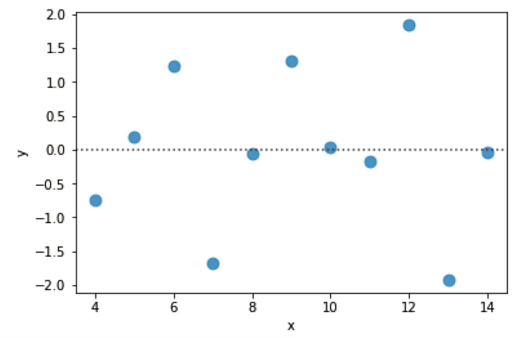 # 残差图sns.residplot(x="x", y="y", data=df[df['dataset']=='I'], scatter_kws={"s":80})