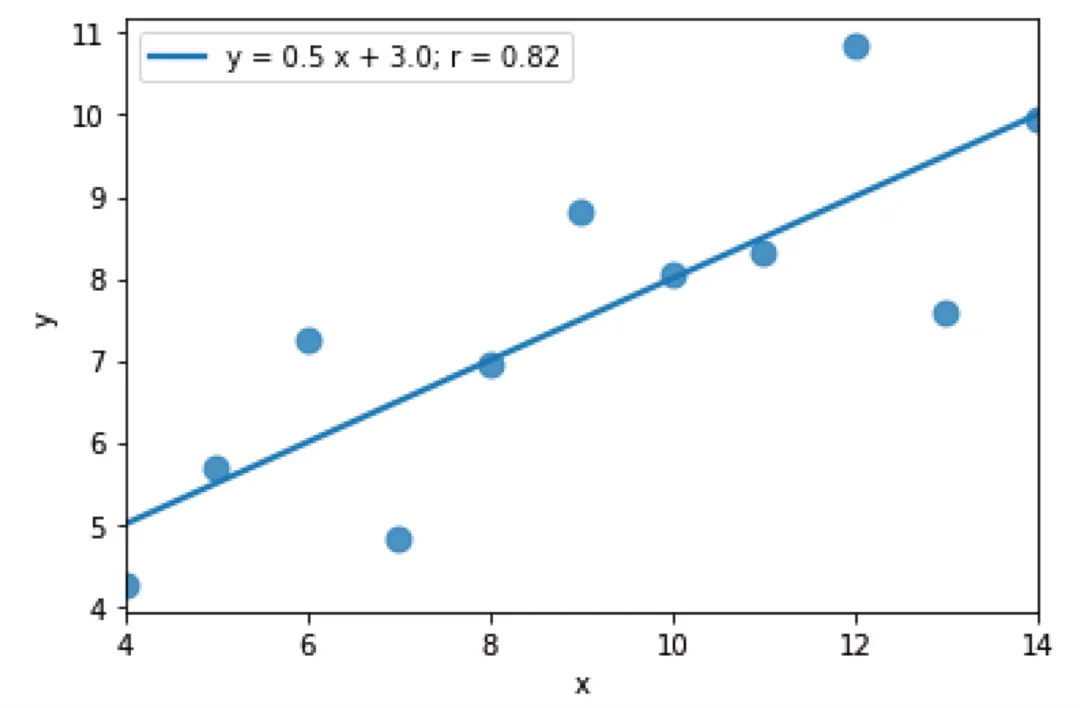 如上所见,区域 I 的数据确实符合线性趋势。若我们想要获取这条趋势线的方程,则可以使用Scipy库来精确算出斜率、截距、R² 等指标::只需再次对区域 I 的数据绘制线性回归图,并添加plot.legend()函数即可。若我们不为该函数设定任何参数,图例的内容将自动生成。from scipy import stats# 线性回归计算slope, intercept, r_value, p_value, std_err = stats.linregress(df[df['dataset']=='I'].x, df[df['dataset']=='I'].y)# 输出结果print(f"斜率: {slope:.1f}")print(f"截距: {intercept:.1f}")print(f"R²: {r_value**2:.2f}")