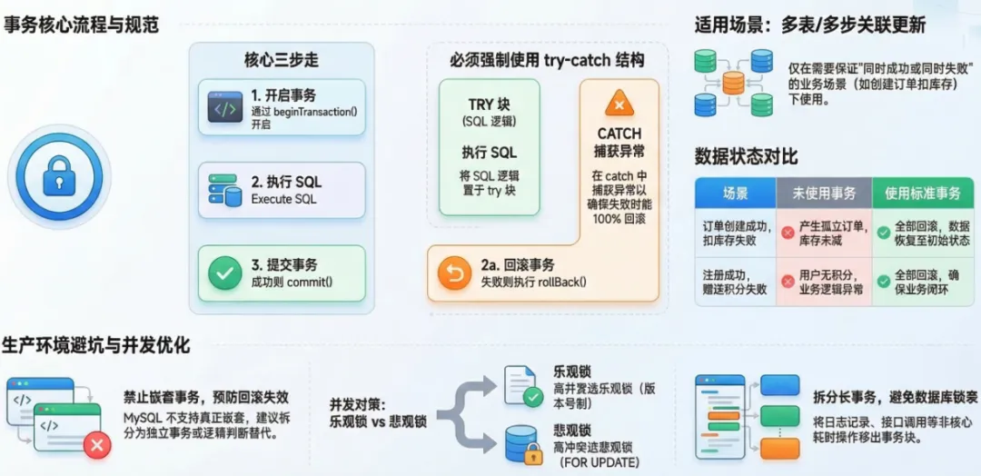记住:事务不是万能的,无需滥用,只有多步操作需要保证一致性时才使用;并发冲突需结合乐观锁/悲观锁,才能彻底避免数据异常。