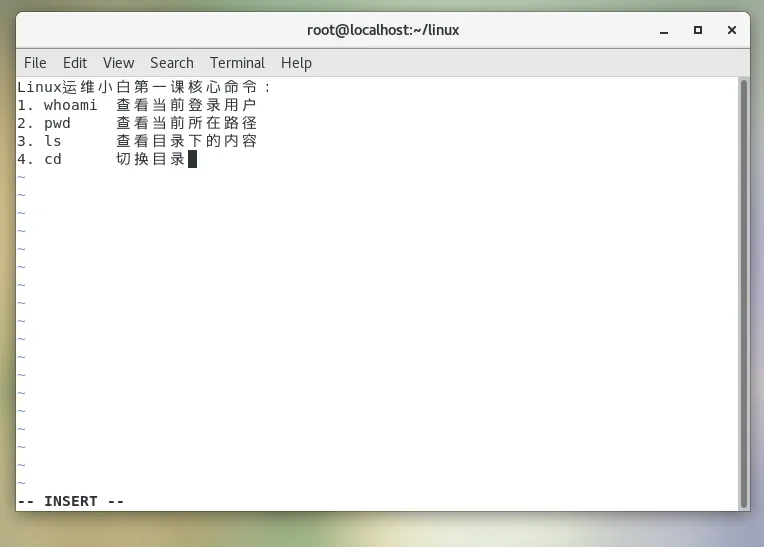 打开文件 → 进入输入模式写内容 → 退出输入模式 → 保存/退出我们用刚才创建的note.txt文件实操,全程跟着敲:作用:打开当前目录下的note.txt文件,如果文件不存在,vi 会自动创建它。打开后你会进入 vi 的界面,左下角会显示文件名,这时候你处于「命令模式」,不能直接输入内容。在命令模式下,按键盘上的i键(i=insert,插入的意思)。看左下角,会出现-- INSERT --的提示,这就说明你成功进入输入模式了!现在可以正常输入内容了。内容输完之后,按键盘上的Esc键,就会退出输入模式,左下角的-- INSERT --会消失,重新回到命令模式。步骤 4:保存文件,退出 vi