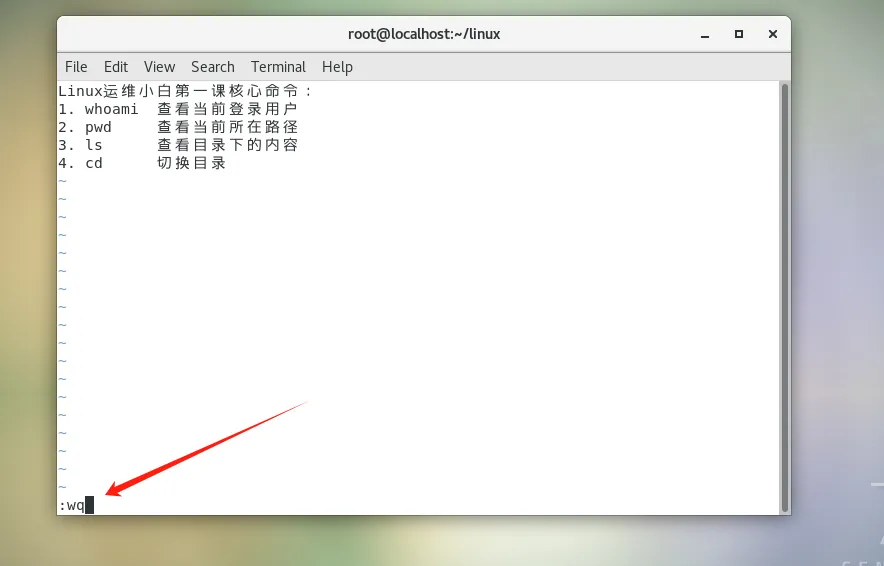 :输入wq,按回车解释:w=write(写入保存),q=quit(退出),合起来就是保存内容并退出 vi,回到终端界面。
