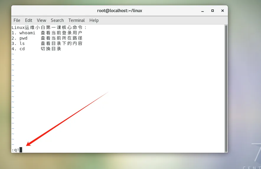 :输入q!,按回车解释:!是强制的意思,不管你改了什么内容,都直接退出,不保存修改,新手操作错了就用这个,不会改坏文件。