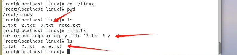 先执行cd ~/linux,确保在学习目录里操作,绝对安全。1. 删除单个文件(rm)