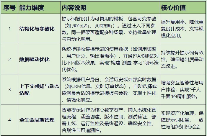 说明:“智能提示词”是提示词在系统工程层面的高级形态。并非指提示词本身具备智能,而是指其被嵌入一个动态、可优化、可管理的系统框架中,从而表现出“智能”的特性。其核心特征包括: