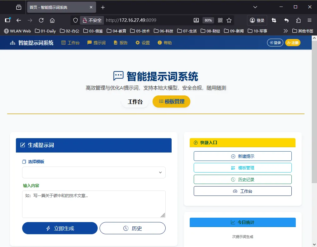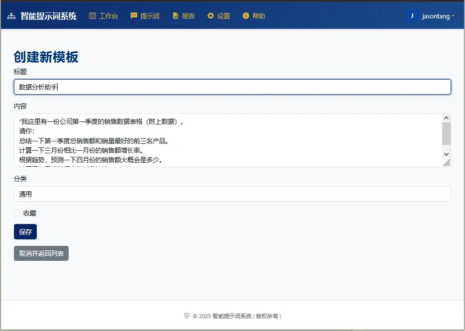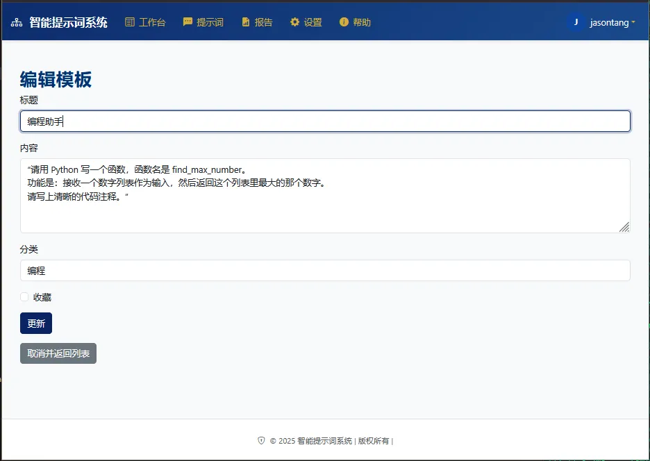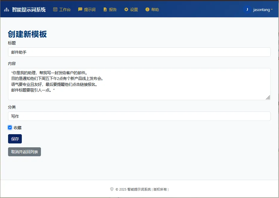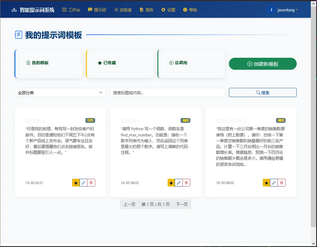 l结构化存储与高效检索:支持提示词的分类管理、标签化组织、全文检索及收藏机制,实现提示词资源的集中化管理与快速调用;