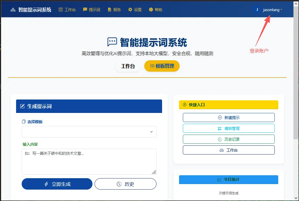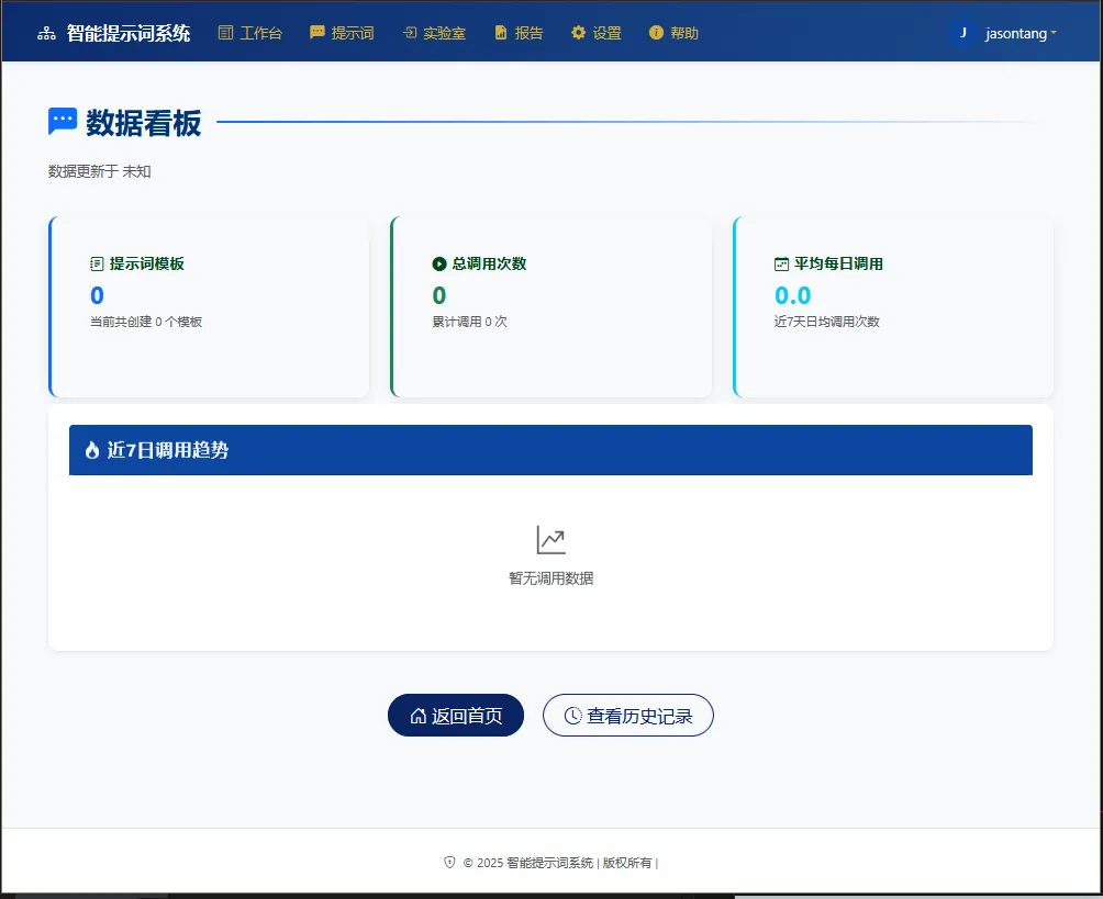 首页就像“驾驶舱”,显示你常用的提示词、最近的使用记录、调用次数和响应速度。可以快速点击你常用的提示词,马上开始使用。