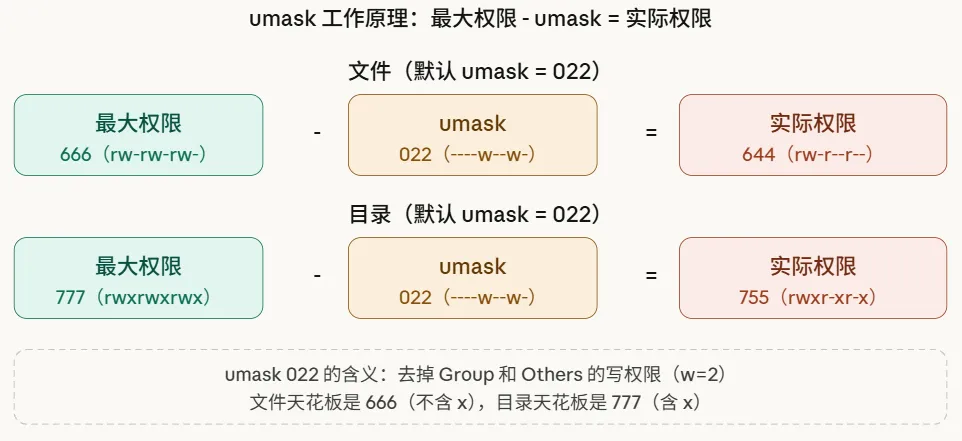 答案是 umask——一个"权限遮罩",从最大权限里减掉不需要的位。