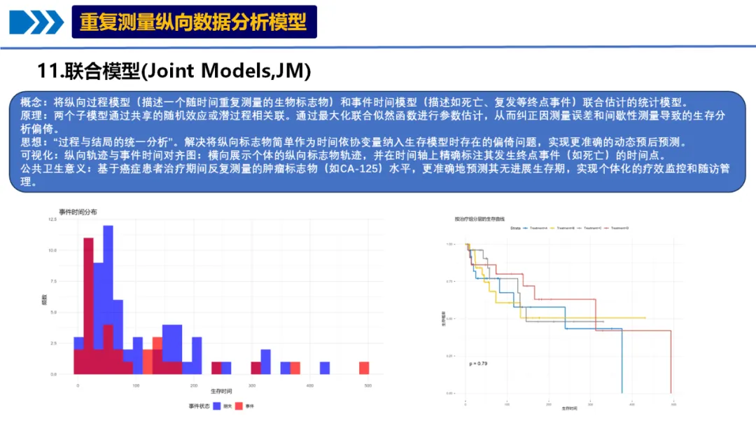 概念:将纵向过程模型(描述一个随时间重复测量的生物标志物)和事件时间模型(描述如死亡、复发等终点事件)联合估计的统计模型。