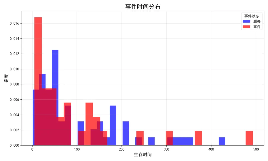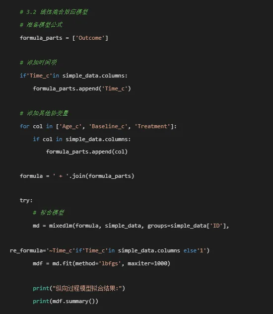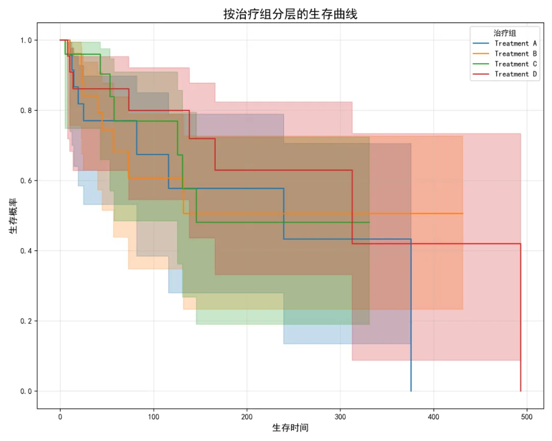 # 保存模型 with open('longitudinal_lme_model.pkl', 'wb') as f: pickle.dump(mdf, f)# 3.3 模型诊断 fig, axes = plt.subplots(2, 3, figsize=(15, 10))# 1. 残差与拟合值图 axes[0, 0].scatter(mdf.fittedvalues, mdf.resid, alpha=0.5) axes[0, 0].axhline(y=0, color='red', linestyle='--') axes[0, 0].set_xlabel('拟合值') axes[0, 0].set_ylabel('残差') axes[0, 0].set_title('残差图') axes[0, 0].grid(True, alpha=0.3)# 2. Q-Q图 stats.probplot(mdf.resid, dist="norm", plot=axes[0, 1]) axes[0, 1].set_title('Q-Q图') axes[0, 1].grid(True, alpha=0.3)# 3. 残差直方图 axes[0, 2].hist(mdf.resid, bins=30, edgecolor='black', alpha=0.7) axes[0, 2].set_xlabel('残差') axes[0, 2].set_ylabel('频数') axes[0, 2].set_title('残差分布') axes[0, 2].grid(True, alpha=0.3)# 4. 观察顺序的残差图 axes[1, 0].plot(mdf.resid, color='blue', alpha=0.7) axes[1, 0].axhline(y=0, color='red', linestyle='--') axes[1, 0].set_xlabel('观察序号') axes[1, 0].set_ylabel('残差') axes[1, 0].set_title('残差序列图') axes[1, 0].grid(True, alpha=0.3)# 5. 拟合值与观测值比较 axes[1, 1].scatter(mdf.fittedvalues, simple_data['Outcome'].iloc[:len(mdf.fittedvalues)], alpha=0.5) axes[1, 1].plot([mdf.fittedvalues.min(), mdf.fittedvalues.max()], [mdf.fittedvalues.min(), mdf.fittedvalues.max()], color='red', linestyle='--') axes[1, 1].set_xlabel('拟合值') axes[1, 1].set_ylabel('观测值') axes[1, 1].set_title('拟合值 vs 观测值') axes[1, 1].grid(True, alpha=0.3)# 6. 随机效应分布 try: random_effects = mdf.random_effectsif len(random_effects) > 0: re_df = pd.DataFrame(random_effects).Tif re_df.shape[1] >= 2: axes[1, 2].scatter(re_df.iloc[:, 0], re_df.iloc[:, 1], alpha=0.5) axes[1, 2].set_xlabel('随机截距') axes[1, 2].set_ylabel('随机斜率')else: axes[1, 2].hist(re_df.iloc[:, 0], bins=30, edgecolor='black', alpha=0.7) axes[1, 2].set_xlabel('随机截距') axes[1, 2].set_ylabel('频数') axes[1, 2].set_title('随机效应分布') axes[1, 2].grid(True, alpha=0.3)else: axes[1, 2].axis('off') except: axes[1, 2].axis('off') plt.suptitle('纵向模型诊断图', fontsize=16) plt.tight_layout() plt.savefig('06_纵向模型诊断图.png', dpi=300) plt.close()# 3.4 纵向轨迹预测# 创建预测数据if'Treatment'in simple_data.columns: treatments = simple_data['Treatment'].dropna().unique()if len(treatments) == 0: treatments = ['Default']else: treatments = ['Default'] time_range = np.linspace(simple_data['Time'].min(), simple_data['Time'].max(), 100) pred_data_list = []for treatment in treatments:for time in time_range: pred_entry = {'Time': time}# 添加标准化时间if'Time_c'in simple_data.columns: time_mean = simple_data['Time'].mean() time_std = simple_data['Time'].std() pred_entry['Time_c'] = (time - time_mean) / time_std# 添加其他协变量for col in ['Age_c', 'Baseline_c']:if col in simple_data.columns: pred_entry[col] = 0if'Treatment'in simple_data.columns: pred_entry['Treatment'] = treatment pred_data_list.append(pred_entry) pred_data = pd.DataFrame(pred_data_list)# 预测固定效应 try: pred_data['pred_fixed'] = mdf.predict(pred_data)# 可视化预测轨迹 plt.figure(figsize=(10, 6))# 原始数据点 plt.scatter(simple_data['Time'], simple_data['Outcome'], alpha=0.1, s=10, color='gray', label='原始数据')# 预测轨迹for treatment in treatments: mask = pred_data['Treatment'] == treatmentif mask.any(): plt.plot(pred_data.loc[mask, 'Time'], pred_data.loc[mask, 'pred_fixed'], linewidth=2, label=f'Treatment {treatment}') plt.title('纵向过程模型预测轨迹', fontsize=16) plt.xlabel('时间点', fontsize=12) plt.ylabel('预测的生物标志物水平', fontsize=12) plt.legend(title='治疗组') plt.grid(True, alpha=0.3) plt.tight_layout() plt.savefig('07_纵向模型预测轨迹.png', dpi=300) plt.close() except Exception as e:print(f"轨迹预测失败: {str(e)}")return mdf, pred_data if'pred_fixed'in pred_data.columns else None except Exception as e:print(f"纵向模型拟合失败: {str(e)}") import traceback traceback.print_exc()return None, None# =========================================================================# 4. 生存模型# =========================================================================def fit_survival_model(survival_data):"""拟合生存模型"""print("\n4. 拟合生存模型...")# 4.1 数据准备 cox_data = survival_data.copy() scaler = StandardScaler()# 标准化数值变量for col in ['Age', 'Baseline_Score']:if col in cox_data.columns: cox_data[f'{col}_c'] = scaler.fit_transform(cox_data[[col]])# 4.2 Cox比例风险模型 cph = CoxPHFitter() try:# 选择协变量 cox_data_dummy = cox_data.copy()# 创建虚拟变量for col in ['Sex', 'Treatment']:if col in cox_data_dummy.columns: cox_data_dummy = pd.get_dummies(cox_data_dummy, columns=[col], drop_first=True, dtype=float)# 确定协变量列 covariate_cols = []for col in cox_data_dummy.columns:if col not in ['ID', 'Survival_Time', 'Event_Status', 'School_ID']:# 检查列是否全是数值if pd.api.types.is_numeric_dtype(cox_data_dummy[col]): covariate_cols.append(col)if len(covariate_cols) == 0:# 如果没有协变量,只使用截距 covariate_cols = []# 拟合Cox模型 cph.fit(cox_data_dummy[['Survival_Time', 'Event_Status'] + covariate_cols], duration_col='Survival_Time', event_col='Event_Status')print("Cox比例风险模型结果:")print(cph.summary)# 保存模型 cph.save_model('cox_model.pkl')# 4.3 模型诊断# 绘制残差图 fig, axes = plt.subplots(2, 2, figsize=(10, 8)) axes = axes.flatten()# 绘制协变量分布for idx, col in enumerate(covariate_cols[:4]): # 只显示前4个if idx >= len(axes):break try: axes[idx].hist(cox_data_dummy[col], bins=30, alpha=0.7, edgecolor='black') axes[idx].set_title(f'{col} 分布') axes[idx].set_xlabel(col) axes[idx].set_ylabel('频数') except: axes[idx].axis('off') plt.suptitle('Cox模型诊断图', fontsize=16) plt.tight_layout() plt.savefig('08_Cox模型诊断图.png', dpi=300) plt.close()# 4.4 风险比森林图 plt.figure(figsize=(10