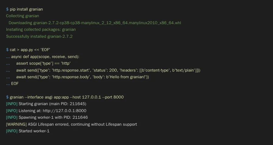 # app.pyasyncdefapp(scope,receive,send):assertscope['type']=='http'awaitsend({'type':'http.response.start','status':200,'headers':[[b'content-type',b'text/plain']],})awaitsend({'type':'http.response.body','body':b'Hello from granian!',})