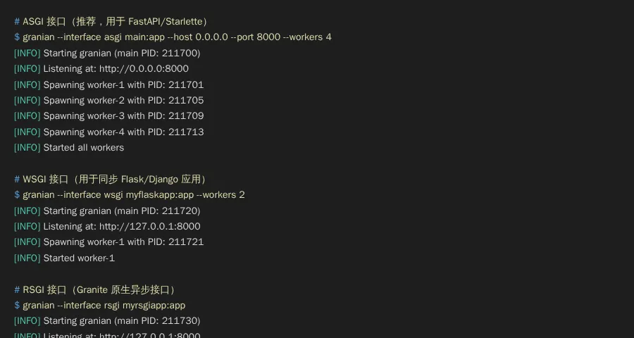 granian 最大的亮点是同时支持 ASGI、RSGI 和 WSGI 三种协议,开发者无需更换应用层代码,只需切换启动参数即可切换协议。以下示例展示同一个简单应用如何分别以 ASGI 和 RSGI 接口启动: