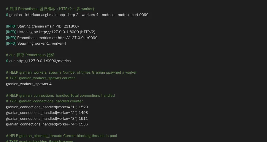 granian 内置 Prometheus 格式的运行时指标导出,方便接入现有监控体系: