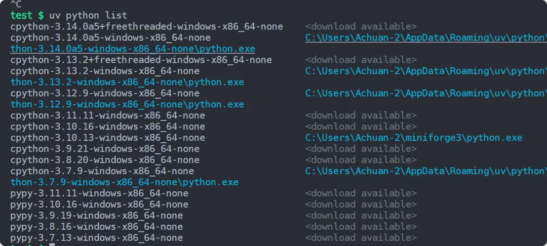 可以使用 uv python list 查看 uv 可安装的 python 版本,目前最低只能是 python 3.7