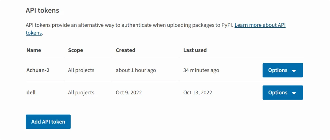 获取 PyPI Token:前往 https://pypi.org/manage/account/,点击 Add API token,获取 Token