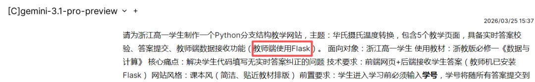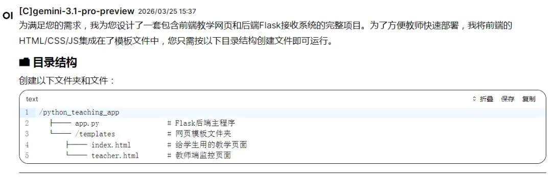 试着结合几个GAI,把自己的任务描述清楚发给GAI,说明自己计算机的配置情况,刚好我们教师机是安装了flask的,可以做交互式的网站。教师可以接收到学生填写的代码、式子,学生也可以从网站中得到反馈。