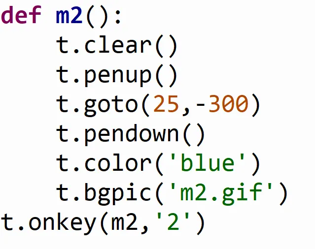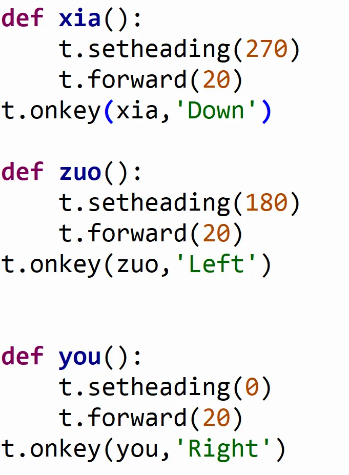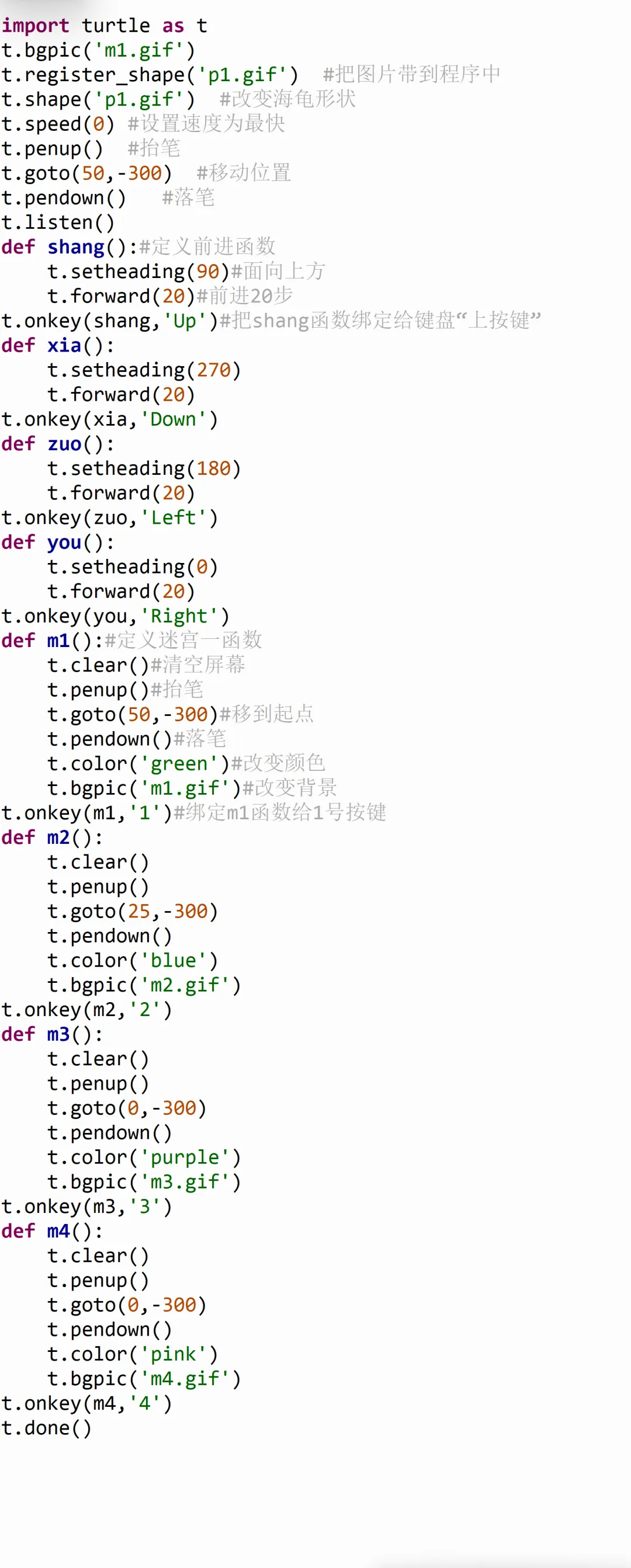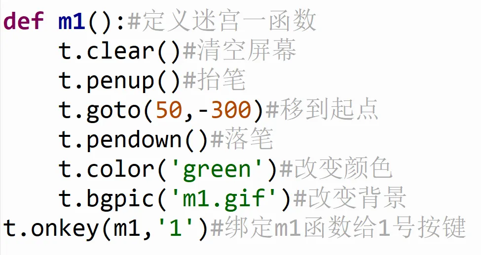 今天我们的python课堂给大家带来一个迷宫大冒险。先看视频,然后我们还是按照我们的习惯,用拆解思维去拆解分析这个作品的具体任务流程(先自己拆解再看我后续的内容)3、小猫的行动路线会形成轨迹,并且每一关的颜色都不一样4、每次换迷宫的时候小猫会回到迷宫入口,并且会清空所有轨迹或者说我问各位同学一个问题,我最先应该完成什么才能让我的迷宫冒险能够开始玩,又有哪一部分属于扩展优化的项目呢?还是先自己想一想,然后有一定想法和思路了再继续看下去。我们的迷宫任务,肯定是先要完成一次迷宫挑战,也就是先添加一张迷宫背景图,然后让小猫动起来,并且留下轨迹,看能否完成第一次迷宫挑战。如果我们顺利完成了第一次挑战,那么就可以再添加新的迷宫,添加颜色变化的任务了。所以接下来我们就按照我们分析的开始程序的编写(背景和角色图片可以在文末的链接自取哈)。今天我们用的还是海龟绘图模块,所以我们还是导入海龟,并且起一个名字叫t。添加背景的函数叫做bgpic(),这个函数用来从本地的文件中导入一张图片当做背景。这里要注意,程序保存的位置要和我们的图片在同一个文件夹里,要不然会出现找不到文件的错误。就像我想安排张三同学去给我拿一根粉笔,我得确保张三在教室里,我才能让他去拿粉笔,我们的程序也必须和图片在一个文件夹才行。今天的角色也不是用的海龟默认的箭头,而是使用的小猫角色,那怎么把我们的角色修改成小猫的样子呢?我们的图片名字叫做“p1.gif”,所以可以用register_shape()函数就可以把我们本地的图片拿到程序里。register其实是注册的意思,我们注册游戏账号,就可以登录游戏了,同样的,把图片注册到程序中,就可以在程序中使用了。然后shape()这个函数就可以改变角色的形状,我们导入哪张图片就把形状改成哪张图片的样子就可以了。导入了背景和角色以后,那我们就要让角色移动到一个初始位置,什么初始位置?移动的逻辑还是先抬笔避免留下痕迹,然后把笔移到指定位置,然后落笔,因为我们要通过落笔来形成海龟的轨迹,从而判断角色是否按照我们正常的迷宫在行走的。那在这里还要添加一个speed函数,让速度变得快一些,让游戏更加流畅,速度也要在移动之前设置。下一步就是让我们的角色动起来,我们用键盘上的上下左右键控制角色移动。我们需要一直检测哪个键按下去了,哪个键没按下去,并且要给某一个指定键按下去了以后要干什么事情做一个设定。我们可以使用t.listen()的函数来监听键盘,这个函数可以获取到键盘上哪一个按键有没有按下去。那接下来就要定义一下我按下去哪个键要干什么事儿了。我们想让人往前走,就定义一个函数叫做“shang”,表示向上。这里setheading()是设置朝向的意思,forward()我们之前学过,让角色向前移动一定的步数。我们的海龟朝向是这么设定的,一开始进入海龟模块面向的最右方是0°方向,正上方是90°方向,左方是180°,下方是270°。所以上面两行代码的作用就是让小猫面向上方,然后移动20步。那角色移动的功能已经设置好了,怎么把按键和这个移动函数对应起来呢?就要用到t.onkey()函数,这个函数可以把我们已经写好的函数绑定给我们规定的按键,用在这里就是把“shang”这个函数绑定给键盘上的“上按键”。要注意的就是上下左右键对应着up,down,left,right,这几个单词的首字母是要大写的,这是程序设计的时候已经规定好的。那一个按键绑定好了以后,向下和左、右的按键,各位就可以根据向上移动的功能,自己去尝试编写了,参考代码如下:那接下来就是优化扩展的任务了,我们可以让游戏里添加多个图片当做背景,逻辑就和角色移动很像了。先定义切换背景的函数,然后绑定给某一个按键就可以了,在这里我用1、2、3、4键来控制四张背景图的切换,因为我只找了4张图,如果想要更多的关卡,可以自己再去找迷宫背景然后用上就可以了。清空屏幕上已经有的画笔痕迹,然后抬笔,移动到起点位置,再落笔,之后就是改变颜色,和改变背景。这里换颜色和换背景的代码可以在函数最前面,也可以在最后面,因为先换和后换没有影响,但是清空屏幕和抬笔、落笔的顺序是不能变的,要不然轨迹就可能会一直留在原地。clear()函数就是清空屏幕上所有画笔痕迹的功能。那最后把我们的“m1”函数绑定给“1”按键就可以了。接下来我们最后的任务,就是写其他背景的函数,要注意,函数名要修改,颜色和背景图都要改,这些各位可能都能想到。有还有一个,因为每张迷宫的起点可能不完全相同,所以我们的起点坐标也要根据实际效果进行微调,左右调节就改x(第一个数),上下调节就改y(第二个数)上图给了大家一个迷宫2的参考程序,其他的迷宫就靠各位自己来实现啦。首先是拆解思维来分析任务逻辑,把大问题拆分成小问题,同时也有顺序思维,让我们的程序按照顺序执行才能完成任务。今天还用了一个思维,叫做第一性原理,今天是不是带大家分析了我们这个任务哪个部分是必要的,哪个部分是优化扩展的呀?这就属于第一性原理的应用,第一性原理是用来思考一件事情最本质最基础的部分是什么,今天我们这个作品,本质是让小猫角色按照我们规定的路线前进,完成挑战,所以我们优先完成这一部分的逻辑。在我们生活中,遇到一些事情的时候,我们也可以用第一性原理来分析这件事