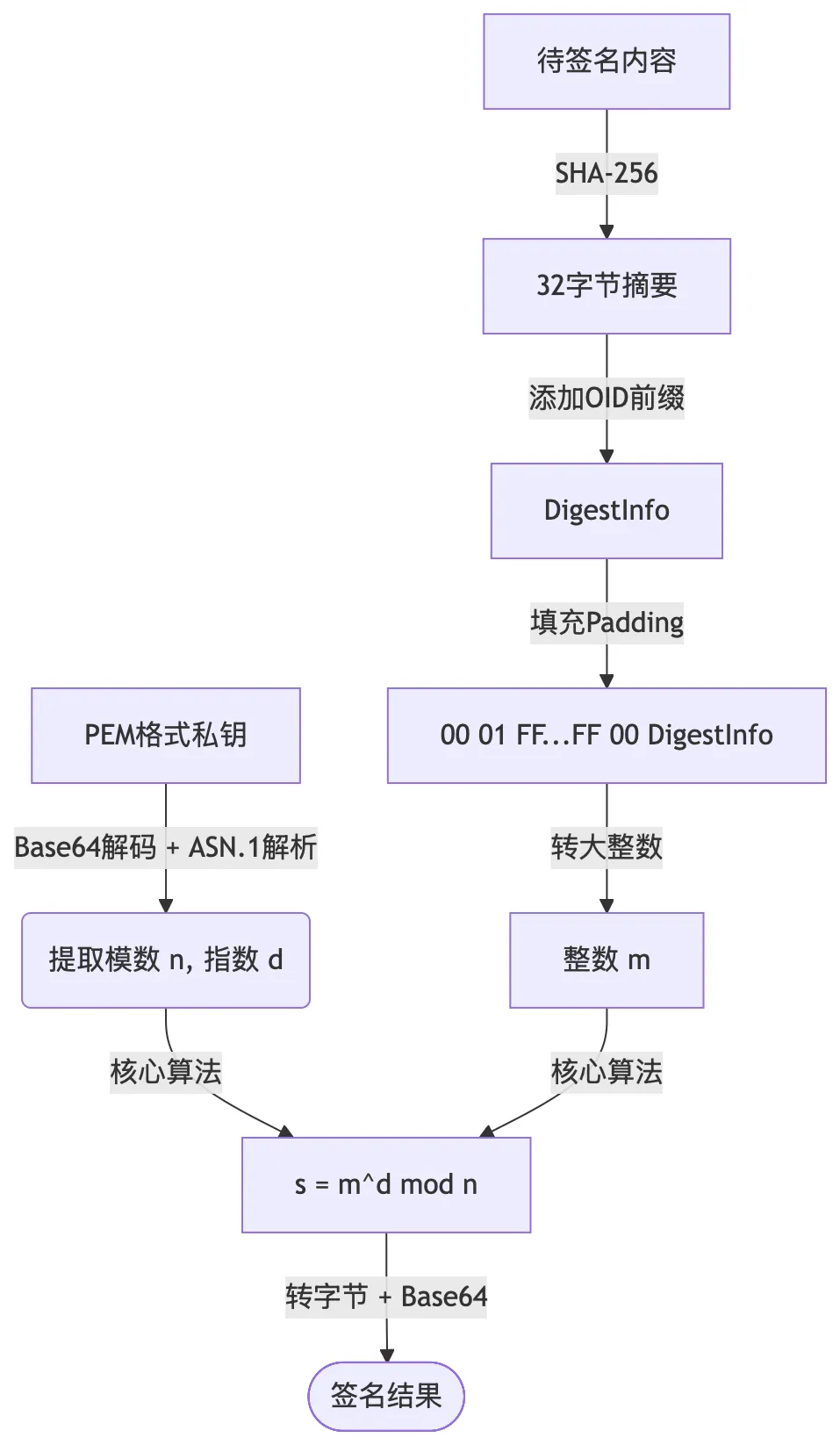 为了摆脱对第三方库的依赖,我们利用 Python 内置的大数运算 pow(m, d, n)手动实现了 PKCS#1 v1.5 签名