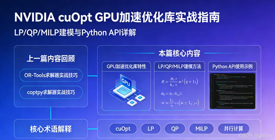 在上一篇中,我们掌握了 OR-Tools 和 coptpy 两大求解器的实战技巧。本篇将聚焦于 NVIDIA cuOpt,一个 GPU 加速的优化库,详细讲解其 LP、QP、MILP 建模与求解的 Python API,并结合核心术语解释,帮助您在大规模优化问题中充分利用 GPU 的并行计算能力。