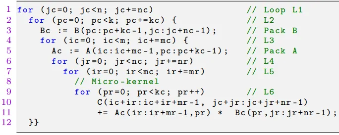 这里最关键的、也是最难优化的部分,就是微内核——图中 L6 循环内部的那一小段代码。它负责用向量指令更新一个 大小的 C 矩阵微瓦片,需要极致的寄存器重用和指令级并行。