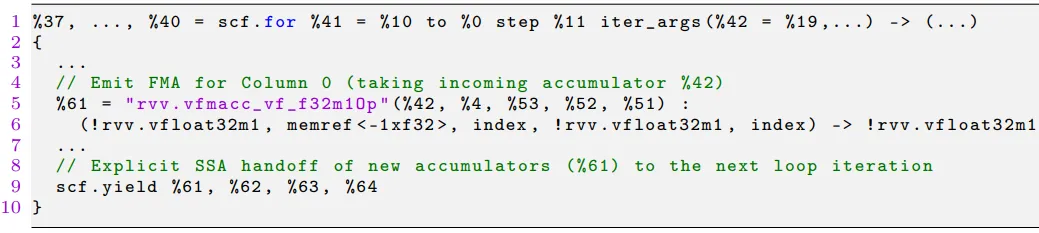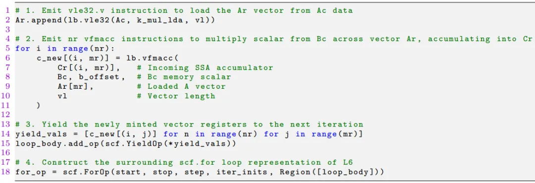 上面这段 Python 代码展示了如何用 xDSL 的 API 构建微内核最内层循环。作者将 RVV 硬件语义融入 xDSL 的高层抽象,通过自定义 API 生成多方言的 MLIR IR,避免了手动编写汇编级代码的低效性,还能动态适配不同 mr/nr 微内核维度,为后续 IR 的下降低级提供了简洁且可扩展的高层抽象基础。