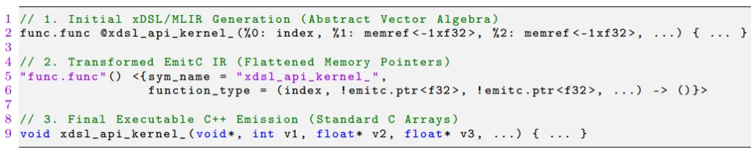 降低的开销:与 MLIR 直接方案相比,xDSL 的降级 Pass 避免了不必要的内存分配和指针间接访问,使得生成的 C 代码更接近手写汇编的效率。