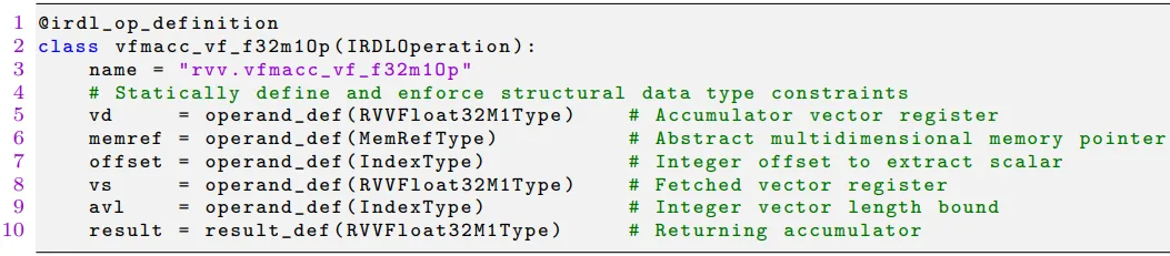 可以看出,通过继承IRDLOperation并定义操作名、操作数和结果,xDSL 可以轻松创建新的 MLIR 方言操作。这个定义明确了 FMA 操作需要 5 个输入(累加器、内存指针、偏移量、向量寄存器、向量长度)和 1 个输出(新的累加器),并强制执行类型约束。