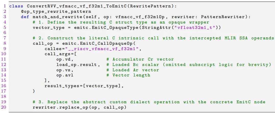 match_and_rewrite函数在遍历 IR 时捕获vfmacc_vf_f32m10p操作,提取其操作数,然后构建一个emitc.CallOpaqueOp,该操作将直接输出 C 语言的 RVV Intrinsic 字符串,如_riscv_vfmacc_vf_f32m1。该重写模式通过 match_and_rewrite 函数拦截自定义 RVV 方言操作,将其转换为 emitc 的透明调用,是 IR 下降低级的核心逻辑。此模式复用了 MLIR 的模式重写基础设施,实现了 RVV 抽象操作到硬件特定代码的自动化映射,避免了手动编写底层内联函数代码的工作量,大幅提升了 RVV 代码生成的自动化程度和可维护性。