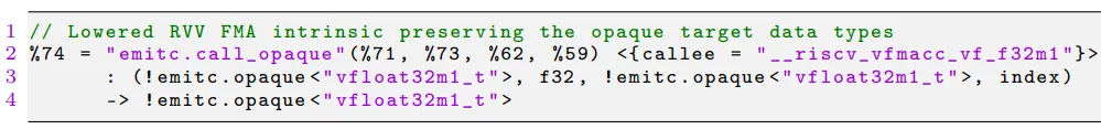 该表示将自定义 RVV FMA 操作转化为 emitc 的 call_opaque 透明调用,保留了 vfloat32m1_t 等 RVV 硬件特定数据类型。此表示是 MLIR IR 到最终 C 代码的关键中间态,其透明调用能直接映射为 RISC-V 的 RVV 原生内联函数,既保障了生成代码的硬件适配性,又完全兼容 MLIR 的官方编译流程,实现了抽象与硬件的无缝衔接。