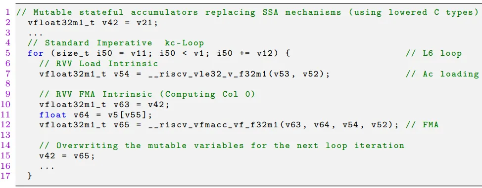 scf.for循环变为 C 的for循环(第 5 行),RVV 操作变为具体的 Intrinsic 调用(第 7、12 行)。可以直接被任何支持 RVV 的 RISC-V 编译器如 gcc编译。注意vfloat32m1_t类型和_riscv_vle32_v_f32m1、_riscv_vfmac_v_f32m1等 RVV Intrinsic,它们与硬件向量长度无关,能够自适应不同的向量寄存器宽度。该代码将 MLIR 的 SSA 形式 IR 转为含 RVV 原生内联函数的标准 C 代码,用可变变量替代 SSA 的寄存器复用,实现了 L6 循环的硬件加速。此代码是 MLIR-xDSL 混合流水线的直接产物,验证了流水线能生成可直接编译执行的 RVV 优化代码,其代码结构高度适配 RISC-V 硬件特性,为 gemm 微内核提供了高效的底层计算实现,是性能提升的核心载体。