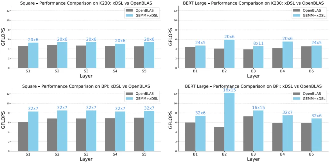 这种巨大差距的原因在于:OpenBLAS 为 BPI 预编译的微内核是 ,而 xDSL 为 B2 层选择了更优的 配置,更好地匹配了矩阵维度(384×384×64),减少了边缘处理开销。