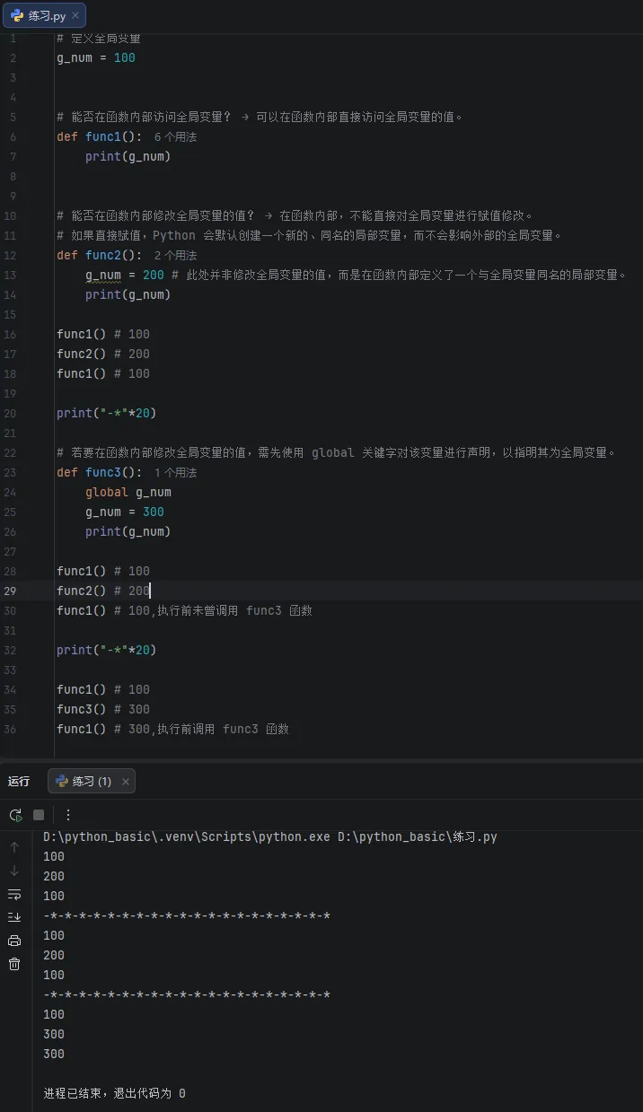 全局变量是指在函数外部定义的变量,其作用域通常覆盖整个程序文件,可以在不同的函数中被访问。在函数内部,可以直接读取全局变量的值;但若要修改其值,则必须使用 global 关键字进行声明。7.函数返回值(一)