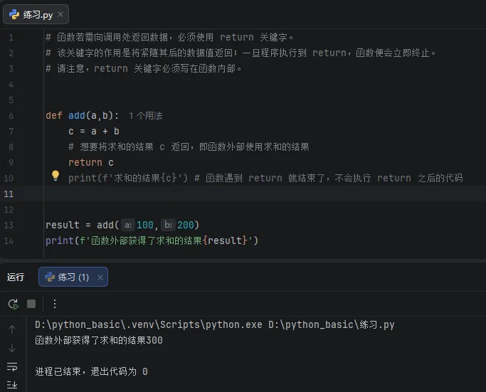 一旦程序执行到 return 语句,函数便会立即终止,其后的所有代码都将不再执行。