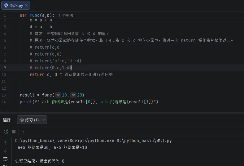 当函数内部定义了局部变量或计算得出某些结果,若需在函数外部访问,可使用 return 关键字将这些值返回。