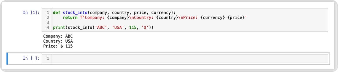 def stock_info(company, country, price, currency): return f'Company: {company}\nCountry: {country}\nPrice: {currency}{price}'