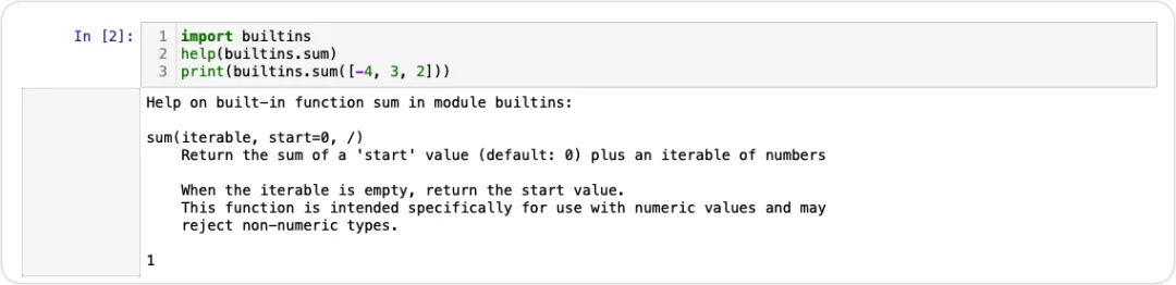 import builtinshelp(builtins.sum)print(builtins.sum([-4, 3, 2]))