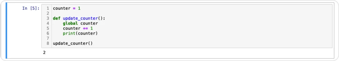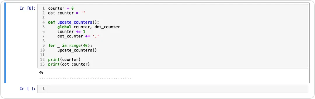 counter = 0dot_counter = ''def update_counters(): global counter, dot_counter counter += 1 dot_counter += '.'