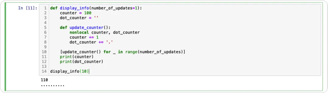 实现了display_info()函数。该函数有一个实现不正确的内部update_counter()函数。请更正此函数的实现,以便可以从内部函数update_counter()修改非局部变量:counter和dot_counter。作为响应,使用number_of_updates参数设置为10来调用display_info()。def display_info(number_of_updates=1): counter = 100 dot_counter = '' def update_counter(): nonlocal counter, dot_counter counter += 1 dot_counter += '.' [update_counter() for _ in range(number_of_updates)] print(counter) print(dot_counter)