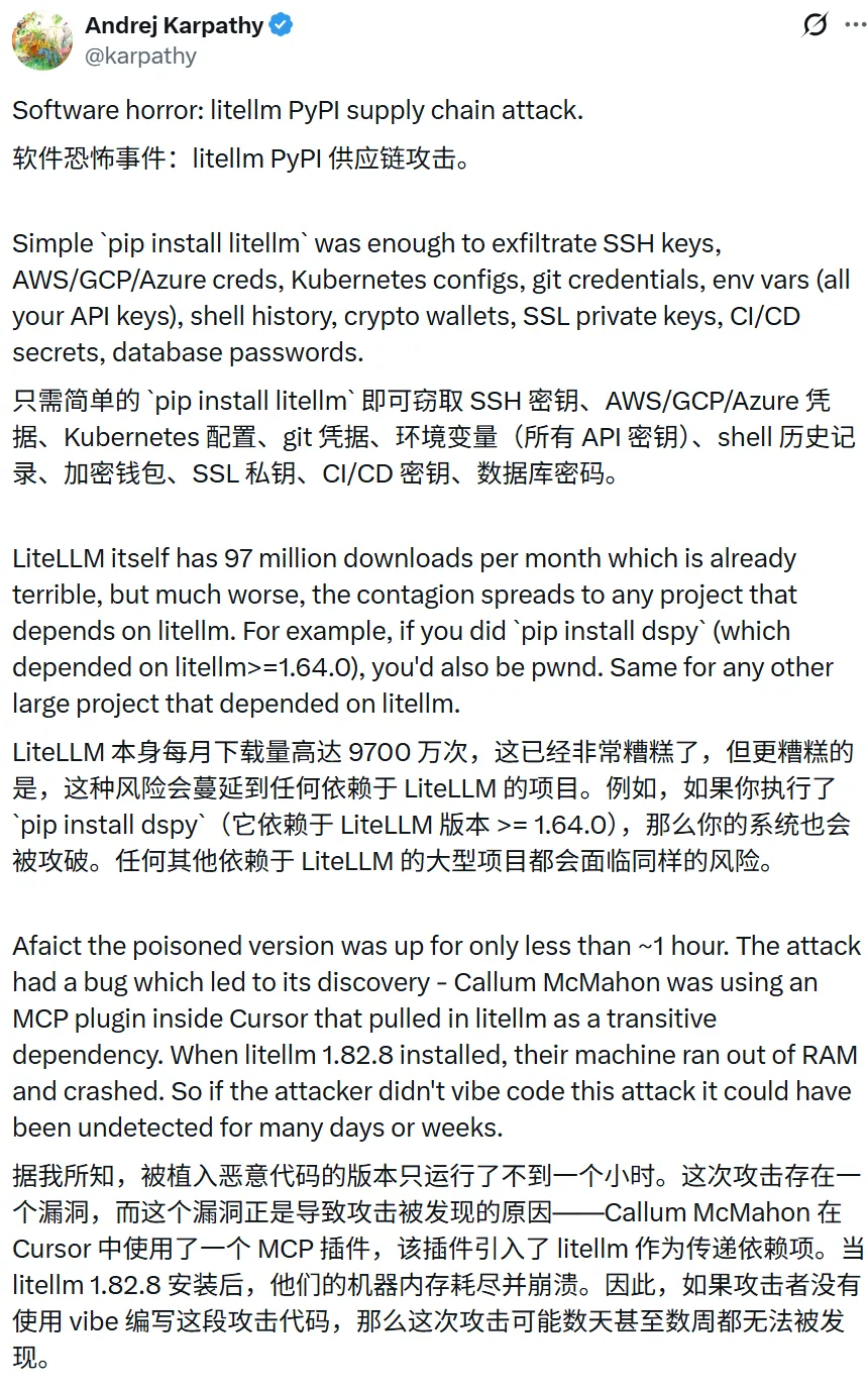 如 Karpathy 提到的 DSPy 等框架,都间接依赖 LiteLLM。所以,哪怕你只是执行了一次 pip install dspy,也可能被“顺带感染”——这种通过供应链传播的攻击,就像病毒一样,会在整个软件生态中扩散。