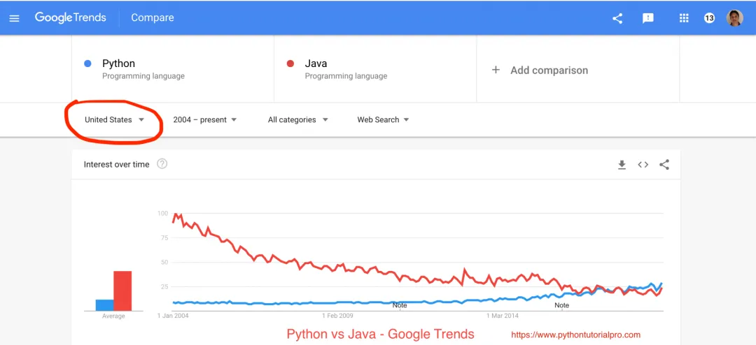 根据谷歌趋势的数据,Python 在美国的受欢迎程度已经超过了 Java。在过去几年里,人们对 Python 的兴趣超过了对 Java 编程语言的兴趣。