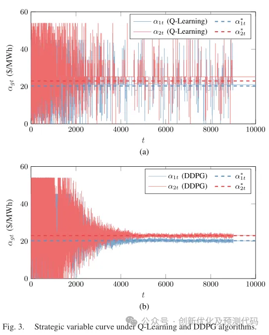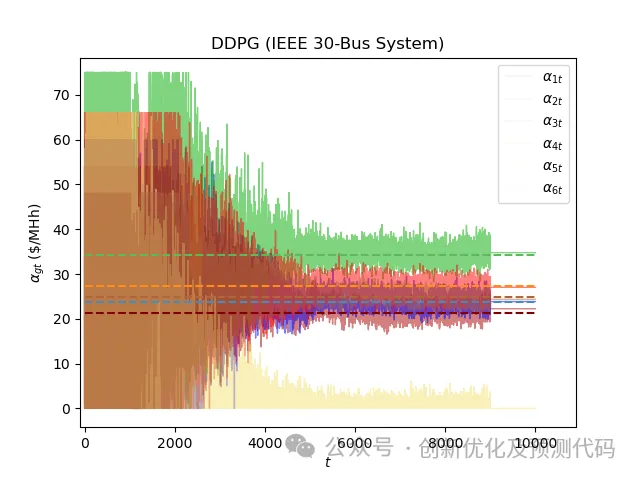 程序使用深层确定性策略梯度算法对发电商进行建模,该算法使用深度神经网络来提高性能并避免状态/动作空间的离散化。所提出的方法被用于模拟几种市场场景,包括不同设置的发电商耐心特性、不同数量的发电商和时变负载。程序中算例丰富、注释清晰、干货满满,创新性很高!下面对文章和程序做简要介绍!