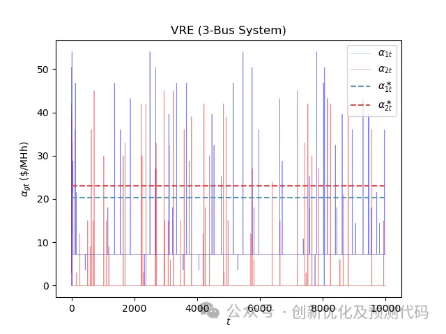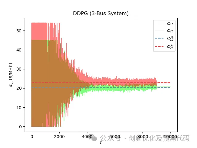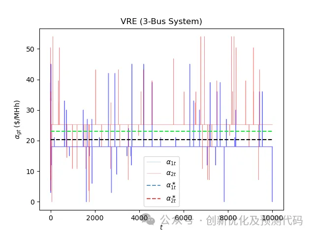 n_agents = 2action_space = np.arange(0, 3.1, 0.2)n_steps = 10000a_real = np.array([15.0, 18.0])obs = 5strategic_variables = np.zeros((n_steps, n_agents))action = multi_agents.select_action(str(obs))alpha = action * a_realnodal_price, profit = market_clearing(alphamulti_agents.learn(str(obs), action, profit, str(next_obs))print('Step:', step + 1, 'a1: %.2f' % alpha[0], 'a2: %.2f' % alpha[1],'r1: %.3f' % profit[0], 'r2: %.3f' % profit[1])plt.plot(strategic_variables[:, 0], lw=0.5, color=C[0], alpha=0.5, label=r"$\alpha_{1t}$")plt.plot(strategic_variables[:, 1], lw=0.5, color=C[1], alpha=0.5, label=r"$\alpha_{2t}$")plt.plot([0, 10000], [20.29, 20.29], '--', color=C[0], label=r"$\alpha_{1t}^\ast$")plt.plot([0, 10000], [22.98, 22.98], '--', color=C[1], label=r"$\alpha_{2t}^\ast$")plt.xlabel(r"$t$")plt.ylabel(r"$\alpha_{gt}$ (\$/MHh)")plt.title("Q-Learning (3-Bus System)")plt.legend()plt.savefig('Q-Learning.png', dpi=600)plt.show()
