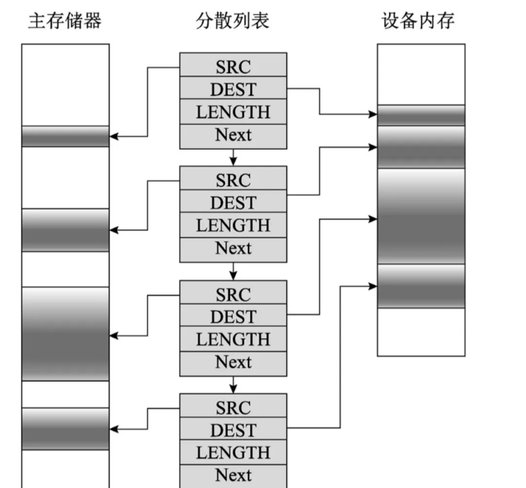 虽然可以对多个缓冲区的内容分别进行DMA,但分散/聚集方式可以通过将分散数组的地址和长度(即分散数组中的元素数量)一起发送给设备,一次性地对整个分散列表进行DMA。