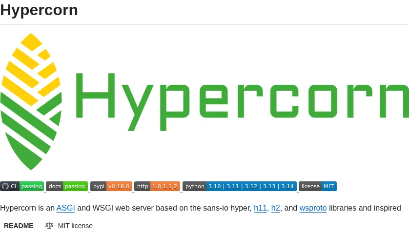 hypercorn 是一个基于 Hyper 系列库(sans-io hyper、h11、h2、wsproto)构建的高性能 ASGI/WSGI 服务器,灵感来源于 Gunicorn。它同时支持 HTTP/1、HTTP/2、WebSocket(over HTTP/1 & HTTP/2),并可借助 uvloop 或 trio 实现异步加速。2026 年的 Python Web 服务选型中,它是一个值得关注的新选择。